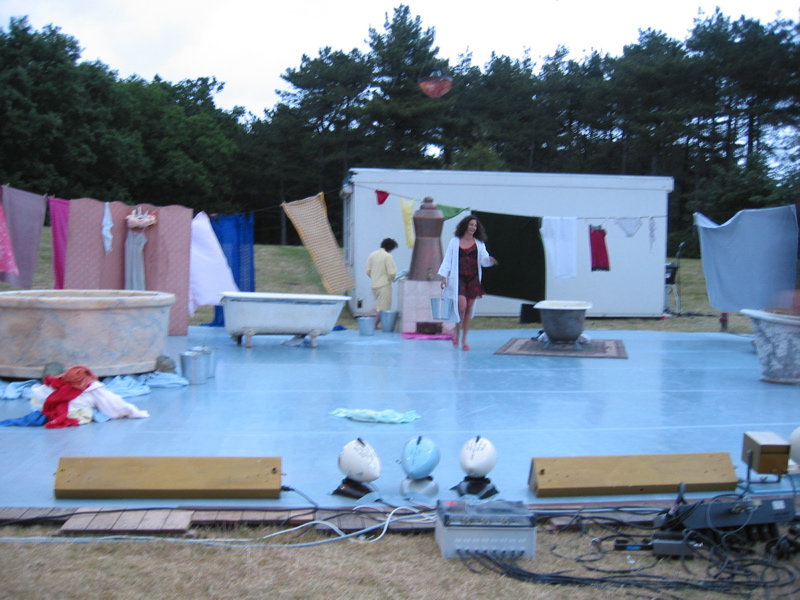 Vrouwen in Bad van Hans Hof Ensemble gaat volgens de tekst in de Oerolgids over de wonderlijke symbiose die vrouwen hebben met hun badkamer. De wereld kan stil komen te staan zodra vrouwen zich daarin terugtrekken. De set is een podium in de buitenlucht met daarop vier badkuipen gedecoreerd met typische badkameraccessoires, badlakens en doeken die te drogen hangen. Er mocht niet gefotografeerd worden, maar we hebben toch een foto van de set kunnen bemachtigen. We hebben verder geen idee wat ons te wachten staat. Het wordt al meteen duidelijk dat beweging en dans de hoofdingrediënten zijn van de performance. Het optreden begint mysterieus en zit vol symboliek. Klassieke muziek en de stem van Maria Callas, afgewisseld met Oosters klinkende fragmenten met een zware beat, dragen bij aan het vervreemdende effect. Zo blijkt er in een van de badkuipen al een lichaam van een vrouw aanwezig te zijn, met hoofd en al gewikkeld in een satijnen doek, druipend en al alsof het een lichaam betreft dat al een tijd onder water lag. Met dit object wordt de gehele voorstelling gesold en de vrouwen dumpen dit lijf steeds bij een ander alsof het om een deel van zichzelf gaat waarmee ze even niet geconfronteerd willen worden.