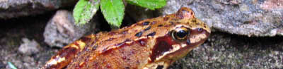 Mijn tuin is een levendig stukje grond met allerlei dieren die daar leven en wonen. Een paar onderdelen van de populatie van mijn tuin vallen extra op. Er zitten hier buitengewoon veel slakken en ook buitengewoon veel kikkers en padden. Die twee typen bewoners horen bij elkaar omdat de ene soort zich voedt met de andere. Sinds een aantal jaren geleden - vooral sinds de buurvrouw een mooie natuurlijke vijver heeft - is het aantal kikkers en padden behoorlijk gegroeid en dat merk je dan weer in de afname van de verwoesting die de slakken plegen aan te richten.Het is een gezellig geluid dat ze produceren die kikkers. Vooral â??s avonds, als de mensen zich terugtrekken in hun huizen roeren de dieren zich en hoor je de vogels fluiten in de bomen van het bos en de kikkers kwaken er op los. Soms hoor je zelfs een soort brommen of knorren. Het enige is dat je je soms rot schrikt als er ineens eentje wegspringt voor je voeten. Deze bruine kikker op de foto maakte zich uit de voeten toen ik er aan kwam lopen maar bleef net lang genoeg stil zitten om even vastgelegd te worden.